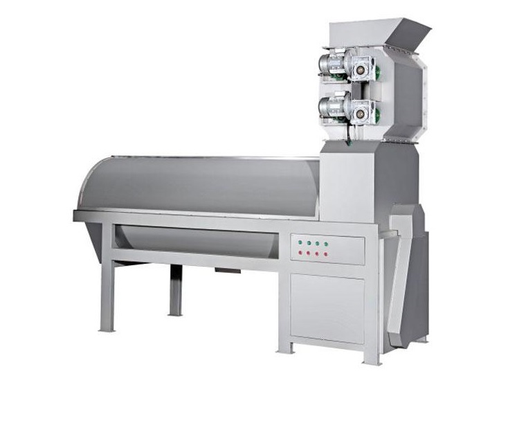 The pomegranate enters the upper crushing installation from the feed hopper. The upper crushing installation presses the pomegranate apart, and the lower crushing installation extrudes the pomegranate again. The pomegranate after two-stage extrusion is separated from the skin and seeds and falls into the separation installation. The pomegranate seeds fall from the sieve hole, and the skin is discharged from the tail. The seeds and juice are pumped to the next process by a separate screw pump.